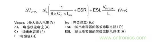 以下是表示輸出紋波電壓的公式。電容器的紋波電壓和ESR的紋波由于相位偏離,故無法進行單純的加算,不過卻是紋波電壓的最差值概算常用的公式。