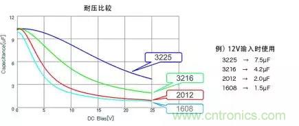 關于DC偏置,當然須選擇影響少的,不過即使電容值、耐壓相同,變動特性也會因封裝尺寸而異。下方圖表為其一例,顯示尺寸大者變動少。總之,請務必從電容器廠商取得充分的信息。