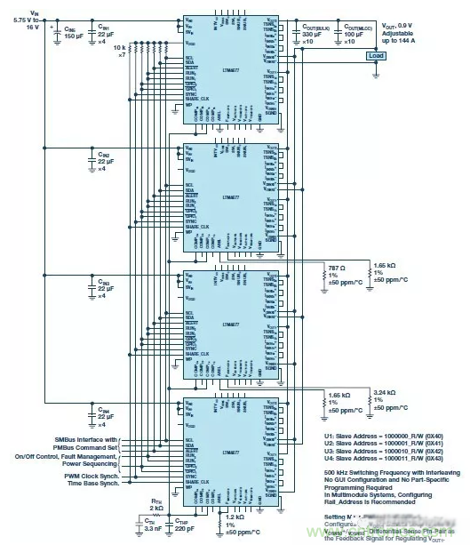 圖7:利用四個LTM4677模塊并聯(lián)的應(yīng)用電路圖,可提供高達144A的電流