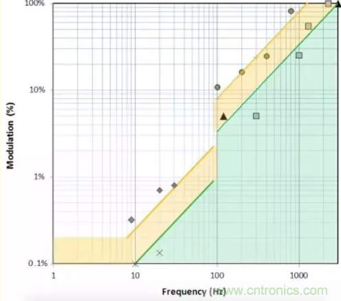 電氣和電子工程師協(xié)會1789-2015年標(biāo)準(zhǔn)首次提出降低人體健康風(fēng)險(xiǎn)的全面建議。上圖顯示的是對人體健康風(fēng)險(xiǎn)較低或無明顯風(fēng)險(xiǎn)(綠色部分)的整個頻率范圍內(nèi)的頻閃限值曲線。