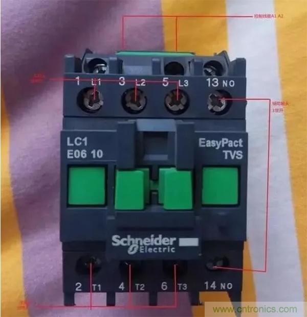 線圈的兩個接線端子,在接觸器的主觸點(diǎn)的稍下方。也有的接觸器A2有兩個接點(diǎn),我們在運(yùn)用的時候隨便接哪一個都行。線圈接線不分零火。