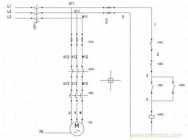接下來我們看一下是怎么應(yīng)用的,先看一下一個帶有過載保護(hù)的接觸器自鎖控制的電路