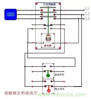 首先電源三相分別接接觸器的主觸點(diǎn)L1,L2,L3,再從接觸器的T1,T2,T3接出三根線接電機(jī)的三個接線柱,以上是主電路。