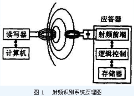 通常情況下, RFID 的應(yīng)用系統(tǒng)主要由讀寫器和RFID 卡兩部分組成的,如圖1 所示. 其中,讀寫器一般作為計算機終端,用來實現(xiàn)對RFID 卡的數(shù)據(jù)讀寫和存儲,它是由控制單元、高頻通訊模塊和天線組成.而RFID 卡則是一種無源的應(yīng)答器,主要是由一塊集成電路( IC) 芯片及其外接天線組成,其中RFID 芯片通常集成有射頻前端、邏輯控制、存儲器等電路 ,有的甚至將天線一起集成在同一芯片上 .