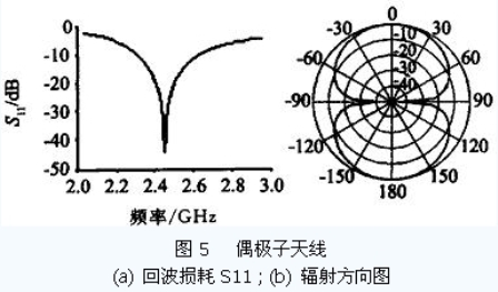當(dāng)單個振子臂的長度l =λ/ 4 時(半波振子) ,輸入阻抗的電抗分量為零,天線輸入阻抗可視為一個純電阻. 在忽略天線粗細的橫向影響下,簡單的偶極子天線設(shè)計可以取振子的長度l 為λ/ 4 的整數(shù)倍,如工作頻率為2. 45 GHz 的半波偶極子天線,其長度約為6 cm.當(dāng)要求偶極子天線有較大的輸入阻抗時,可采用圖4b的折合振子.