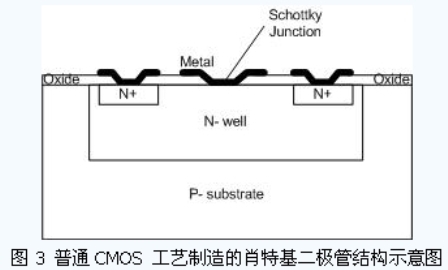 在一般的無源UHF RFID 標(biāo)簽的應(yīng)用中,出于成本的考慮,希望芯片電路適合于普通CMOS工藝的制造。而遠距離讀寫的要求對電源恢復(fù)電路的功率轉(zhuǎn)換效率提出了較高的要求。為此,很多設(shè)計者采用標(biāo)準CMOS 工藝來實現(xiàn)肖特基勢壘二極管,從而可以方便地采用多級Dickson倍壓電路結(jié)構(gòu)來提高電源轉(zhuǎn)換的性能。圖3 所示是普通CMOS 工藝制造的肖特基二極管結(jié)構(gòu)示意圖。在設(shè)計中,不需要更改工藝步驟和掩膜板生成規(guī)則,只需在版圖上作一些修改,就可以制作出肖特基二極管。