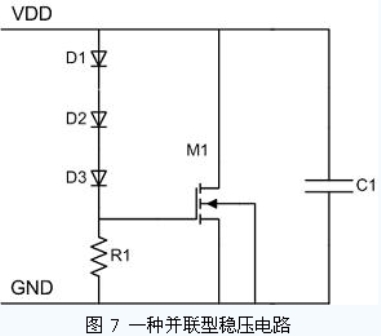 在RFID 標(biāo)簽芯片中,需要有一個較大電容值的儲能電容存儲足夠的電荷以供標(biāo)簽在接收調(diào)制信號時,仍可在輸入能量較小的時刻(例如OOK調(diào)制中無載波發(fā)出的時刻),維持芯片的電源電壓。如果輸入能量過高,電源電壓升高到一定程度,穩(wěn)壓電路中電壓感應(yīng)器將控制泄流源將儲能電容上的多余電荷釋放掉,以此達到穩(wěn)壓的目的。圖7 是其中一種并聯(lián)型穩(wěn)壓電路。三個串聯(lián)的二極管D1、D2、D3 與電阻R1 組成電壓感應(yīng)器,控制泄流管M1 的柵極電壓。當(dāng)電源電壓超過三個二極管開啟電壓之和后,M1 柵極電壓升高,M1 導(dǎo)通,開始對儲能電容C1 放電。