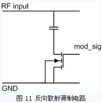無源UHF RFID 標(biāo)簽一般采用反向散射的調(diào)制方法,即通過改變芯片輸入阻抗來改變芯片與天線間的反射系數(shù),從而達到調(diào)制的目的。一般設(shè)計天線阻抗與芯片輸入阻抗使其在未調(diào)制時接近功率匹配,而在調(diào)制時,使其反射系數(shù)增加。常用的反向散射方法是在天線的兩個輸入端間并聯(lián)一個接有開關(guān)的電容,如圖11 所示,調(diào)制信號通過控制開關(guān)的開啟,決定了電容是否接入芯片輸入端,從而改變了芯片的輸入阻抗。
