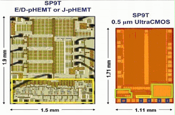 隨著多頻段手機(jī)越來越流行,對(duì)高集成度、小型天線開關(guān)的需求也越來越迫切。UltraCMOS SP7T開關(guān)現(xiàn)在已經(jīng)開始批量生產(chǎn),SP9T也在2007年底投入批量生產(chǎn)。在外形方面,GaAs SP7T為1.6x1.5mm,而采用SOS工藝SP7T開關(guān)只有1.2x1.0mm,面積縮小了一半。目前的GaAs E/D pHemt或J-pHemt SP9T開關(guān)外形尺寸為1.9x1.5mm。與之相比,采用UltraCMOS 0.5μm工藝制造的SP9T外形尺寸為1.7x1.1mm(圖3),它不需要片外ESD器件和性能增強(qiáng)匹配器件。UltraCMOS發(fā)展規(guī)劃預(yù)計(jì)0.25μm版本的SP9T尺寸將達(dá)到1.32x1.29mm。