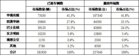 2008年,中國(guó)車載公交視聽系統(tǒng)市場(chǎng)品牌競(jìng)爭(zhēng)格局中,華視傳媒憑借其強(qiáng)大的采用數(shù)字移動(dòng)電視技術(shù)的聯(lián)播網(wǎng)以及其靈活獨(dú)特的合作模式,成為中國(guó)車載公交視聽系統(tǒng)市場(chǎng)已裝車輛和播放終端兩大指標(biāo)的市場(chǎng)第一,緊隨其后的是世通華納和巴士在線,東方明珠由于主要局限于上海市場(chǎng),市場(chǎng)排名為第四。作為地方的車載視聽系統(tǒng)運(yùn)營(yíng)商視博公交,則完全局限于杭州本土市場(chǎng)發(fā)展。DMG集團(tuán)公司,由于更加集中于地鐵視頻廣告的運(yùn)營(yíng)和推廣,在全國(guó)的整體實(shí)力上,還不足以顛覆目前的格局。
