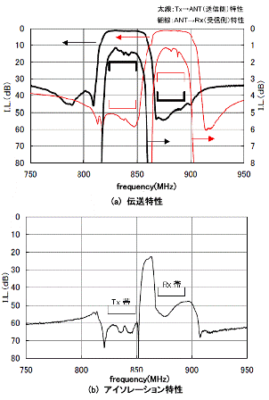 舉例來(lái)說(shuō),圖1所示的是BAND5(800MHz )收發(fā)雙工器(產(chǎn)品尺寸2.5×2.0×0.6mm)的傳輸特性以及隔離度。一般的隔離度和過(guò)濾性的損耗是相互制約的關(guān)系,但本產(chǎn)品對(duì)于Tx頻段能實(shí)現(xiàn)60dB的高隔離度,同時(shí)使Rx損耗維持在1.8dB。