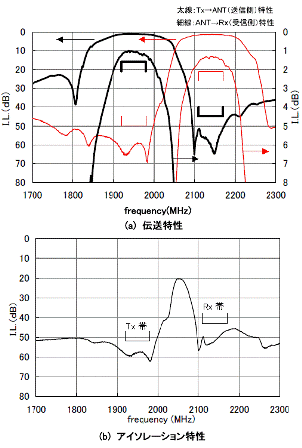 第二個(gè)例子,以圖2的BAND1(2GHz)收發(fā)雙工器(產(chǎn)品尺寸3.0×2.5×1.1mm)的特性為例。將特殊的設(shè)計(jì)技術(shù)引入到表面波難以實(shí)現(xiàn)低損耗的BAND1(2GHz)中來(lái),在得到實(shí)際使用所需的隔離度的同時(shí),還能實(shí)現(xiàn)Tx損耗1.4dB 和Rx損耗1.8dB這樣杰出的低損耗特性。一直以來(lái),介質(zhì)收發(fā)雙工器在BAND1(2GHz)頻帶曾一度占據(jù)了主流的地位,而目前表面波做到了不亞于它的損耗值。由此,表面波收發(fā)雙工器替代了介質(zhì)收發(fā)雙工器成為了當(dāng)今主流。