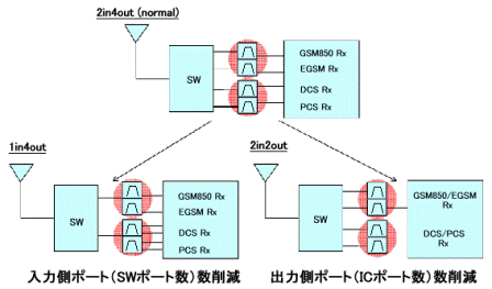 在手機(jī)的高頻率無(wú)線通信電路中使用的表面波濾波器,分為CDMA收發(fā)用的級(jí)間濾波器和GSM用的TOP濾波器等。村田的濾波器不僅具有低損耗和高抑制度的電特性,還由小型、薄型的各種產(chǎn)品尺寸構(gòu)成了豐富的商品線,可以對(duì)應(yīng)各種電路設(shè)計(jì)的需求。例如, 在多頻段發(fā)展的高頻無(wú)線通信電路中,為了減小電路基板上的貼裝面積,將兩個(gè)頻帶的單濾波器(產(chǎn)品尺寸1.35×1.05×0.5mm)合二為一,制造出了雙濾波器(產(chǎn)品尺寸1.8×1.35×0.5mm)。此外還運(yùn)用特殊的技術(shù)制造許多獨(dú)特的商品,如將雙層濾波器的輸入端合并為一個(gè)的1in4out產(chǎn)品,以及將平衡器的輸出端合并為一的2in2out產(chǎn)品等。通過(guò)共用輸入端可以節(jié)省原本用于分頻的開(kāi)關(guān)(SW)。同時(shí),共用平衡輸出端可以使連接濾波器的高頻IC的端口數(shù)目減少(圖3)。這是在表面波濾波器的設(shè)計(jì)中通過(guò)調(diào)整阻抗和相位等方法,從而使差分端口實(shí)現(xiàn)共用。這些濾波器可以在多頻帶化發(fā)展的高頻無(wú)線電路中,為外圍電路的簡(jiǎn)化及電路整體的小型化做出貢獻(xiàn)。今后村田制作所將繼續(xù)致力于研發(fā)更小型化和高性能化,同時(shí)又具有輸入端以及輸出端共用功能的單濾波器、雙濾波器產(chǎn)品。