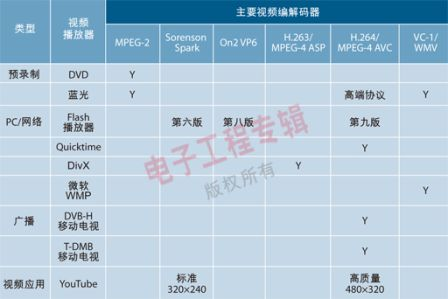 對于想在手機(jī)上觀看視頻的用戶來說,移動多媒體處理器需要識別和支持多種視頻編碼標(biāo)準(zhǔn)。表1列出了目前在用的各種視頻編解碼器。內(nèi)容兼容性是支持“任何地方,任何內(nèi)容”這個理想目標(biāo)的關(guān)鍵。為了推進(jìn)移動視頻的普及,用戶不必知道他們的設(shè)備支持何種格式或分辨率。用戶也許不能在他們的手機(jī)上以全高清的分辨率觀看高清編碼的視頻,但他們希望能用手機(jī)播放出來,并能輸送到電視機(jī)上觀看。