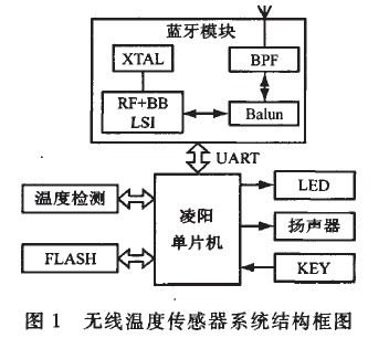 無線溫度傳感器主要由單片機控制單元、藍牙模塊、溫度檢測單元、接口電路及其它輔助電路組成,系統結構如圖1所示。控制單元凌陽單片機為整個系統的核心,對檢測到的溫度數據進行轉換、顯示、傳輸,外擴4MBFLASH用于存儲程序和溫度數據。藍牙模塊包括藍牙芯片、放大器、非平衡變壓器(Balun)等,負責與藍牙控制終端進行無線連接和數據傳輸,按鍵完成系統設置、復位等信息輸人,測量的溫度數據在傳輸到控制終端的同時在LED上顯示,并通過揚聲器定時語音播報當前溫度數據和超限報警。