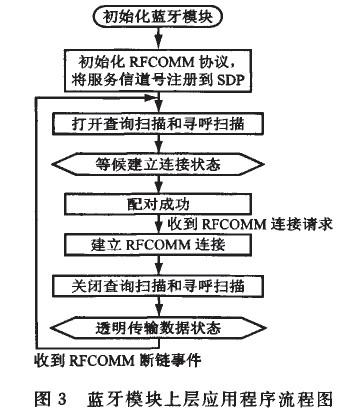 本系統是基于藍牙的串口應用模型SPP(SerialPortProfile)實現無線數據的透明傳輸,在核心協議棧之上編寫自己的上層應用程序。CSR的藍牙核心協議棧包括HCI、LZCAP、SDP、RFCOMM等,以固件的形式提供給開發人員,用戶編寫的應用程序和協議棧一起運行在CSR嵌人式環境中。在CSR程序中,不同任務之間可以異步地發送消息,每一個任務在創建的時候可以讓其中一個擁有消息隊列,其它的就把發給任務的消息提交給該消息隊列,由任務調度程序自動運行獲得任務的消息。藍牙模塊上層應用程序流程如圖3所示。