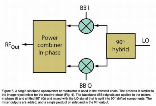 至于上變頻,我們有SSB混頻器或I/Q調(diào)制器。在SSB IRM中,鏡像和有效輸出現(xiàn)在是這種拓?fù)浣Y(jié)構(gòu)中的輸入,RFIn是RFOut。圖5通過BB(基帶)輸入頻率或發(fā)射通路中的IF信號(hào)簡(jiǎn)化了這種配置。式 15-21顯示這種SSB或I/Q調(diào)制器如何抑制或減少鏡像。