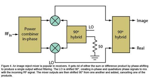 圖4:鏡像抑制混頻器在接收器中最受歡迎。它可以通過相移去掉和頻或差頻產(chǎn)物,產(chǎn)生單個(gè)輸出,而不需要濾波。LO進(jìn)行90°相移,產(chǎn)生同相和正交相位信號(hào),與輸入的RF信號(hào)進(jìn)行混頻。然后混頻器輸出互相進(jìn)行90°相移,從而去掉部分產(chǎn)物。