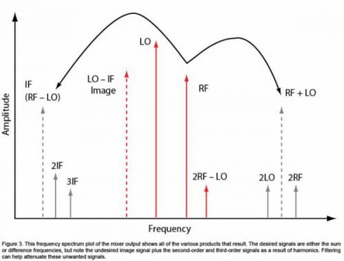 圖3:混頻器輸出的頻譜圖顯示產(chǎn)生的所有不同產(chǎn)物。需要的信號(hào)為和頻或差頻,不過請(qǐng)注意,有害鏡像信號(hào)和二階和三階信號(hào)為諧波的結(jié)果。濾波有助于減少這些有害信號(hào)。