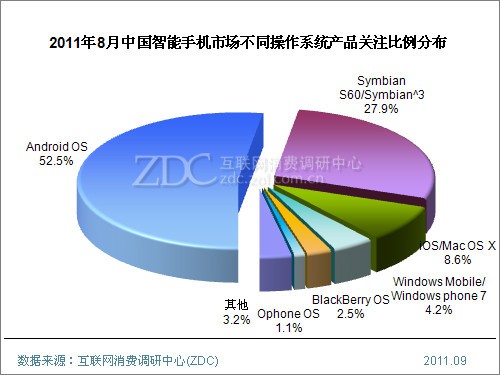 ZDC數據顯示,2011年8月中國智能手機市場上,搭載Android操作系統的智能手機用戶關注度已經達到52.5%,較上月再度攀升2個百分點。而諾基亞Symbian系統智能手機的關注度則持續下滑,本月跌破三成。其他操作系統產品關注比例變動幅度不大。