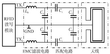 EMC濾波電路濾去了載波頻率為13. 56 MHz阻抗變換時的諧波干擾。它有一個固定的諧振頻率,這個頻率是實際數(shù)據(jù)傳輸率和最高副載波頻率的結(jié)合。如用曼切斯特編碼時,傳輸?shù)淖罡邤?shù)據(jù)率為424 kbit/ s,頻率為848 kHz,則諧振頻率為14. 408MHz。