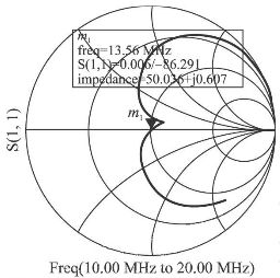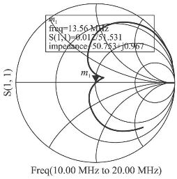 手動調(diào)諧即是交替不斷調(diào)整電容C1、C2 的值,同時觀察曲線變化,直到在所要求的頻率點S11等于0。圖2為某一天線電路在頻率在10~20MHz之間變化時,其反射系數(shù)的變化曲線,其中,標(biāo)記13. 56MHz的點, S11值近似為0,達(dá)到了匹配要求。