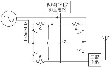(1)測量電橋 用來測試天線的反射系數(shù)。主體部分為惠斯通電路,如圖4所示。其電路中的直流電源用波形產(chǎn)生器替代,用來生成13. 56 MHz的正弦載波信號。其中電阻R1、R2、R3 都為50 Ω。