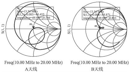在載波頻率為13. 56 MHz時,通過在TX1 和TX2 兩點測量天線線路的反射系數(shù)(即參數(shù)S11 )來手動調(diào)諧,直到天線電路的輸入阻抗達(dá)到目標(biāo),計算方程如下:
