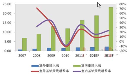 2007-2013年中國基站天線市場容量及增速(單位:百萬套)