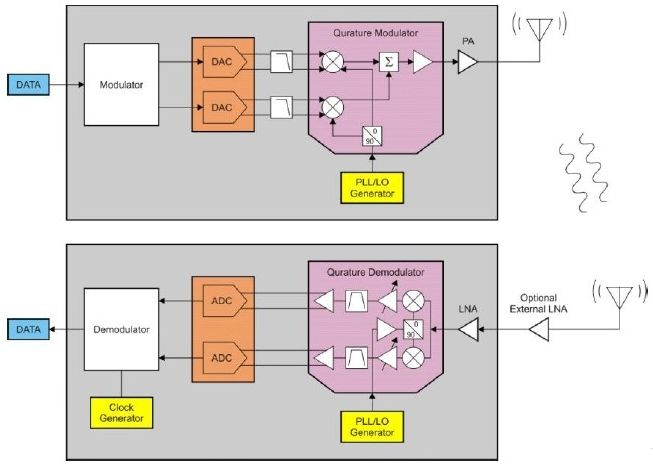 典型的低功耗無線鏈路由一個發送器件和一個或多個接收器件組成。發送器件由一個調制器、合成器、升頻混頻器和一個功率放大器(PA)組成。接收機由互逆器件、低噪聲放大器(LNA)、降頻混頻器、合成器和解調器組成。