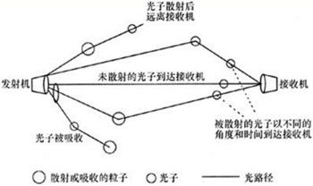 對天氣非常敏感是FSO的另一個主要問題。晴天對FSO傳輸質量的影響最小,而雨、雪和霧的影響較大。據測試,FSO 受天氣影響的衰減經驗值分別為:晴天,5~15dB/km;雨天,20~50dB/km;雪天,50-150dB/km;霧天,50~300dB/km。可見影響最大的是霧天,這是因為霧中的散射粒子的半徑與激光的波長在同一數量級上,而且散射粒子非常集中,從而使光線的傳播方向發生偏轉,造成空間、角度和時間上的擴展,如圖2。對于這種大氣現象處理的方式,與微波通信中對待雨衰相似。要在系統傳輸的計算中,為光信號的衰減留有足夠的系統功率余量,以便在出現濃霧最大衰減的情況下,仍能接收到所需的光信號功率。重要的是,要獲得所在地長期的氣象統計資料,能夠知道不同等級(能見度)的霧,即不同衰減的大氣介質出現的統計規律。如果了解到衰減值大于某一指標出現的概率,就能確定光無線系統為了保證可用性的指標(比如99.9%),需要容納多大的大氣損耗。而傳輸距離的計算公式如式(1)所示。