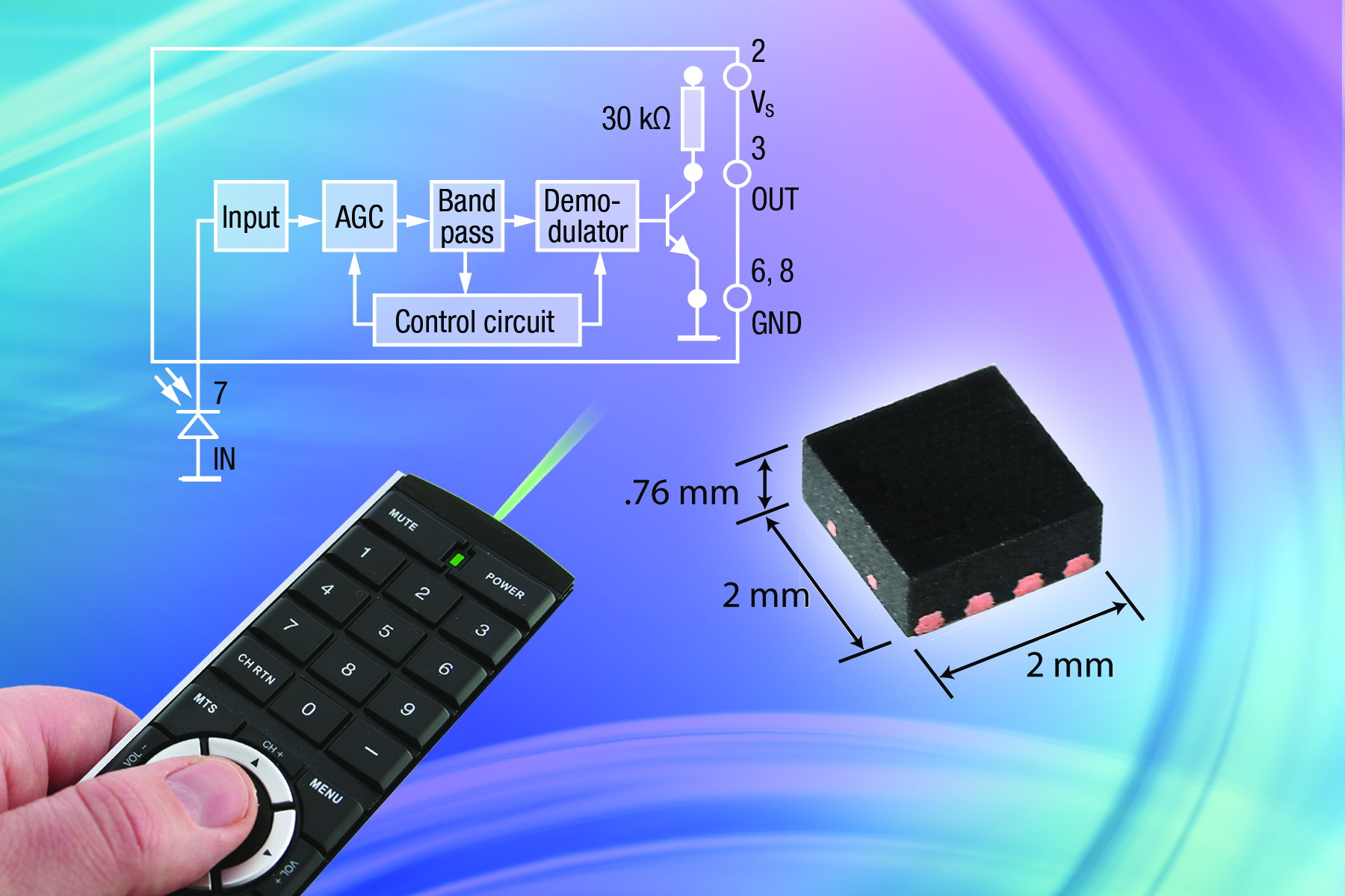 Vishay的標準遙控接收器是將光敏二極管和信號調制IC裝配在同一封裝內。VSOP383..和VSOP584..是把信號調制IC與光敏二極管分開,單獨封裝于QFN封裝里,為各種應用提供了極大的靈活性。例如,可以采用多個光敏二極管對準不同方向來實現超寬空間接收信號的系統,光敏管還可以采用可滿足特殊要求的封裝,或是接收非傳統波長,例如藍光,用于水下作業或可見光通信。
