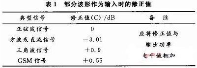 上述情況僅適用于900 MHz~8 GHz的正弦波輸入信號(hào),而通信系統(tǒng)中,還有其他的波形,如果測(cè)量其他的波形的功率,則可根據(jù)不同波形的修正C值來(lái)進(jìn)行修正,因波形不同修正值也不相同,表1為不同的信號(hào)波形的修正值。