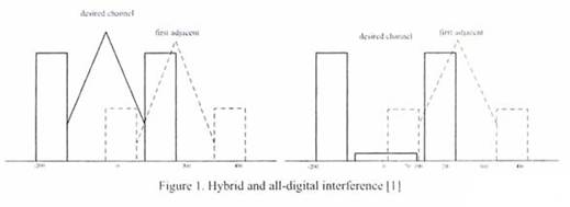 HD無線技術不需要新的頻譜,因為它可利用現有的AM和FM頻段。在HD無線廣播業內,存在混合與全數字兩種形式。混合模式是在兩個鄰近邊頻帶上傳輸數字信號,在兩個頻帶之間播送模擬信號。全數字模式消除了模擬信道,采用全數字傳輸。與FM和AM信號獲取相比,在接收這種信號時涉及到大量的數字信號處理。對于數字邊頻帶,去除鄰近的模擬信道是必需的(圖1),更復雜的調制方案涉及到正交頻分復用(OFDM)。