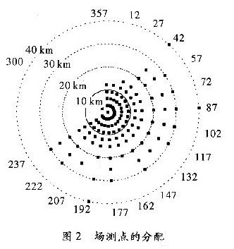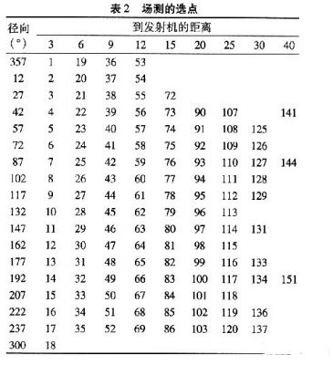 覆蓋測試是根據(jù)特定的半徑和幅角在圓周上進行選點的,這些測試點的選擇總共包含18個不同幅角(12,27,42,58,72,87,102,117,132,147,162,177,182,207,222,287,300,357),對應于以發(fā)射機為圓心的3,6,9,12,15,20,25,30和40 km這幾個半徑上。選點是出于幅角的考慮,展現(xiàn)了至少45 dBμV/m內(nèi)的場強估計,并根據(jù)地形信息通過算法得到有用信息。圖2展示了場測選點的地形分配,測試點的具體參數(shù),如表2所示。