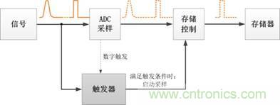 這就要靠觸發系統來實現。觸發的原理是一直監控信號流,若發現信號滿足設定的觸發條件,觸發器記錄滿足條件的信號,啟動采樣;待數據采集完畢后,由控制器對信號進行處理和顯示。具體如下圖1所示。