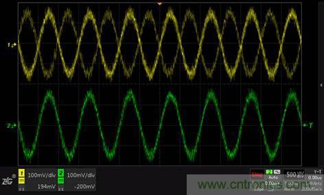 圖3 CH1不開啟高頻抑制觸發不穩,CH2開啟高頻抑制