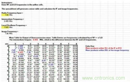 圖2. 樣本混頻器表,顯示在混頻過程中產生的多種nf1 ± mf2產物,其中f1和f2分別是混頻器的RF輸入和本振輸入頻率。