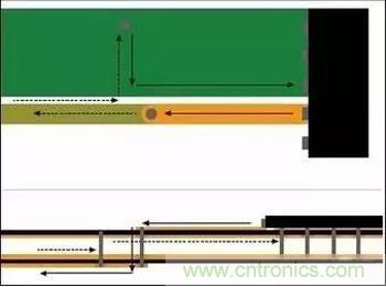 流經所布線路的所有電流都有相等的回流。耦合策略固然很多,不過回流通常流經相鄰的接地層或與信號線路并行布置的接地。在參考層繼續時,所有耦合都僅限于傳輸線路,一切都非常正常。不過,如果信號線路從頂層切換至內部或底層時,回流也必須獲得路徑。