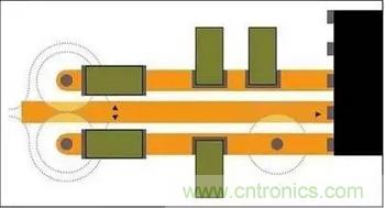 每個這些通孔都會在內接地層上產生大于通孔直徑自身的禁入區,提供制造空隙。這些禁入區很容易在回流路徑上造成中斷。一些通孔彼此靠近則會形成接地層溝,頂層CAD視圖看不見,這將導致情況進一步復雜化。圖2兩個電源層通孔的接地層空隙可產生重疊的禁入區,并在返回路徑上造成中斷。回流只能轉道繞過接地層禁入區,形成現在常見的發射感應路徑問題。