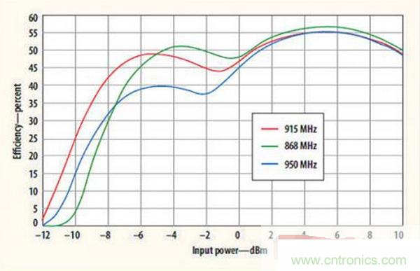 圖1顯示了Powercast P2110 Powerharvester接收器在多個頻段的性能,包括中心頻率為915MHz的工業(yè)-科學-醫(yī)療(ISM)頻段。