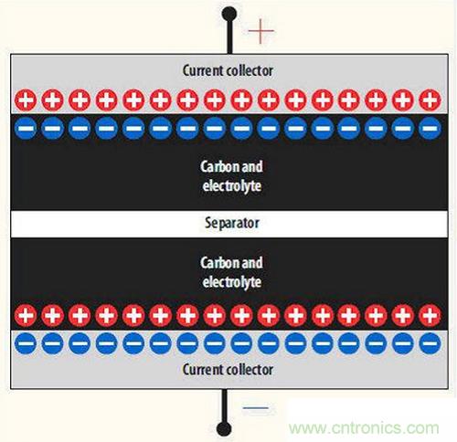 圖2是EDLC電容的橫截面圖。從圖中可以看到兩個由電解液包圍著的納米顆粒活性碳層,電解液中間則有一個“隔離”層。這兩個碳層與集電極相接觸,并由集電極將電流輸送到外部。這兩個碳層由兩個串聯(lián)電容組成,因此命名為雙層電容或DLC。由于電容內(nèi)的電荷載體實際上處于離子態(tài),因此使用了術(shù)語電化學DLC(或EDLC)。這張圖也顯示了簡單的原理,其中電荷主要集中在集電極-碳接口。電容(C)直接正比于有效面積(A),并反比于這些電荷(或C a A/d)之間的隔離距離(d)。雙層電容的正負電荷之間的間距在納米范圍,這正是EDLC電容容量如此大的原因(因為這個間距要比靜電電容的電荷間距小好幾個數(shù)量級)。
