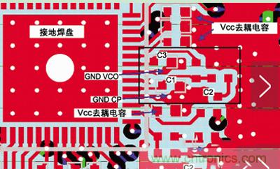 在本文的后面部分將會看到,PLL的實現在系統設計中總是面臨巨大挑戰,要想獲得滿意的雜散特性必須有良好的地線布局。目前,IC設計中將所有的PLL和VCO都集成到了芯片內部,大多數PLL都利用數字電流電荷泵輸出通過一個環路濾波器控制VCO。通常,需要用二階或三階的RC環路濾波器濾除電荷泵的數字脈沖電流,得到模擬控制電壓??拷姾杀幂敵龅膬蓚€電容必須直接與電荷泵電路的地連接。這樣,可以隔離地回路的脈沖電流通路,盡量減小LO中相應的雜散頻率。第三個電容(對于三階濾波器)應該直接與VCO的地層連接,以避免控制電壓隨數字電流浮動。如果違背這些原則,將會導致相當大的雜散成分。