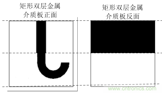 四分之一波長單極子天線要求延伸出的輻射電長度為四分之一波長,其輻射場分為近場與遠場,近場是比較復(fù)雜的電磁耦合轉(zhuǎn)換環(huán)境。本節(jié)所設(shè)計的類單極子C形缺地探針長度也為四分之一波長,利用近場的磁生電的原理進行信號探測。其結(jié)構(gòu)圖如下圖1所示,主體由微帶50ohm饋線和C形缺地線組成: