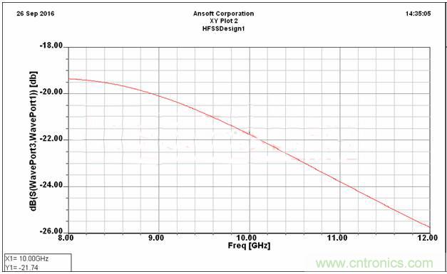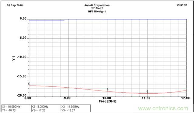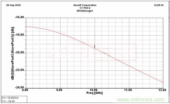 添加的C形環(huán)受到相同的磁場耦合,產(chǎn)生與主線相反的電流,從而對主線進行二次耦合,增強了主線的耦合度。仿真了1mm耦合間距的耦合度,仿真結(jié)果如下圖4所示。在10GHz耦合-18.72dB,x波段耦合度-17.25~-19.27dB,波動2dB左右。