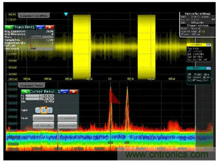 很多用慣了示波器的人都喜歡示波器的觸發(fā)功能,用各種觸發(fā)方式來隔離各種事件,穩(wěn)定顯示,觀察異常。在傳統(tǒng)頻譜儀上是很難實(shí)現(xiàn)觸發(fā)的,但是當(dāng)我們發(fā)現(xiàn)示波器的模板觸發(fā)方式,很容做到,把時(shí)域波形的實(shí)時(shí)頻譜變到頻域來觀察,借助MASK 測(cè)試的一些小工具,居然輕松設(shè)置和輕松觸發(fā)。因?yàn)槟0宓男螤钭杂删庉嫞|發(fā)的動(dòng)作自由組合,這樣的波形分析已經(jīng)完全跨越的時(shí)域和頻域的使用習(xí)慣,完全融合了時(shí)域和頻域?qū)π盘?hào)的思維方法了。