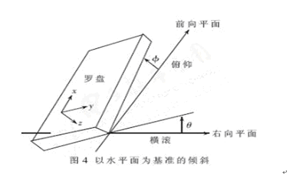 地球磁場(chǎng)的強(qiáng)度為0.6高斯左右,現(xiàn)有的磁阻傳感器可以很好地測(cè)量地磁場(chǎng)范圍內(nèi)的磁場(chǎng)強(qiáng)度。由于二維羅盤(pán)只能在保持水平的情況下正常工作,如果用于車(chē)輛的動(dòng)態(tài)環(huán)境中,將不可能保證其永遠(yuǎn)水平,所以在這種場(chǎng)合下,羅盤(pán)的可使用性大大降低。于是需要設(shè)計(jì)三維羅盤(pán)以適應(yīng)各種姿態(tài)的測(cè)量。三維電子羅盤(pán)的總體設(shè)計(jì)方案如圖3所示。三軸磁阻傳感器分別從X、Y、Z 三個(gè)磁場(chǎng)強(qiáng)度方向輸出電壓,經(jīng)過(guò)放大電路分別輸入到三個(gè)具有A/D轉(zhuǎn)換能力的MCU端口,二軸加速度傳感器測(cè)量俯仰角度和橫滾角度,測(cè)量參數(shù)的意義如圖4所示。