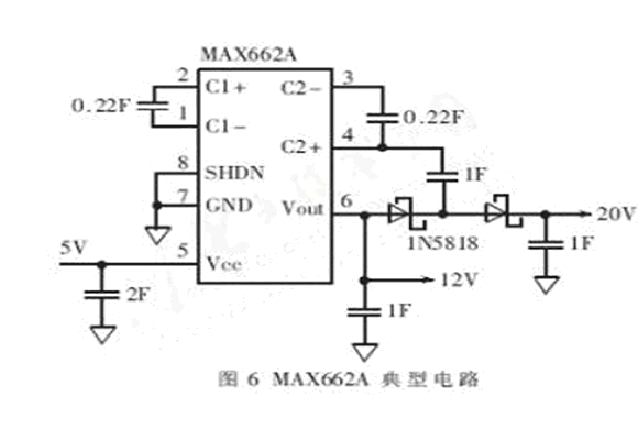 在HMC1055芯片上,置位/復(fù)位片的引腳名稱(chēng)是S/R+和S/R-,沒(méi)有極性的區(qū)別,單個(gè)置位/復(fù)位帶標(biāo)準(zhǔn)阻值為2.0Ω,所以對(duì)于三軸系統(tǒng),三個(gè)金屬片串聯(lián)阻值為6.0Ω,則產(chǎn)生一個(gè)3~4A的最小脈沖驅(qū)動(dòng)一個(gè)6Ω的負(fù)載所需的供電電壓為18V~24V。由于系統(tǒng)芯片都是使用5V電源,所以需要將5V電壓升壓到20V左右,可以使用MAX662來(lái)完成。典型的電路如圖6所示。