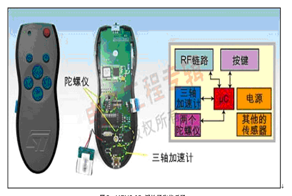 MEMS加速計與陀螺儀配合使用,可以把更先進的選擇功能變?yōu)楝F(xiàn)實,例如:能夠在空中操作的三維鼠標和遙控器。在這些設(shè)備中,傳感器檢測到用戶的手勢,將其轉(zhuǎn)換成PC屏幕上的光標移動或機頂盒和電視機的頻道和功能選擇。圖5是一個含有MEMS傳感器的遙控器解決方案,MEMS傳感器組、兩個陀螺儀和一個加速計檢測手腕或鼠標在空中的動作,同時微控制器執(zhí)行動作跟蹤和手勢識別功能。然后,重組的運動曲線通過無線連接發(fā)送到機頂盒或PC機,無線鏈路可以采用紅外或射頻,具體視應(yīng)用要求而定。