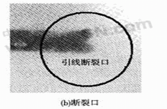 用于引線鍵合的鍵合線有Al線和Au線,由于Au線性能更優,所以壓力傳感器的鍵合工藝選用Au線。鍵合時要使鍵合面保持清沽,否則會影響鍵合強度,等離子清洗是一種能有效提高鍵合強度的方法。由于機油壓力傳感器工作環境惡劣,尤其是頻繁的振動會導致金絲有缺陷的地方疲勞斷裂,或者最容易疲勞的位置如第二焊點附近的頸部位置發生斷裂,因此要求更高的鍵合質量。曾對所研制的機油壓力傳感器進行了臺架試驗,在一批試驗樣品中經過6×105次加壓和卸壓試驗之后,發現有兩個樣品失效,故障分析結果表明:一個樣品的失效模式為信號處理電路上的一個電阻損壞;另一個樣品的失效模式為金絲線斷裂,如圖4(a),(b)所示。對于這種情況,可以采用雙金絲鍵合工藝,并盡量選用高純度、低缺陷的金絲,并做好引線鍵合前各封裝器件的清潔工作,如圖4(c)所示。這樣對金絲鍵合工藝進行改進后,在可靠性試驗中,未曾出現金絲斷裂的質量問題。
